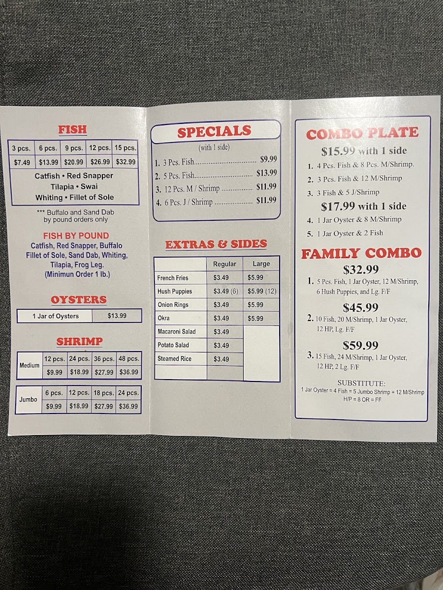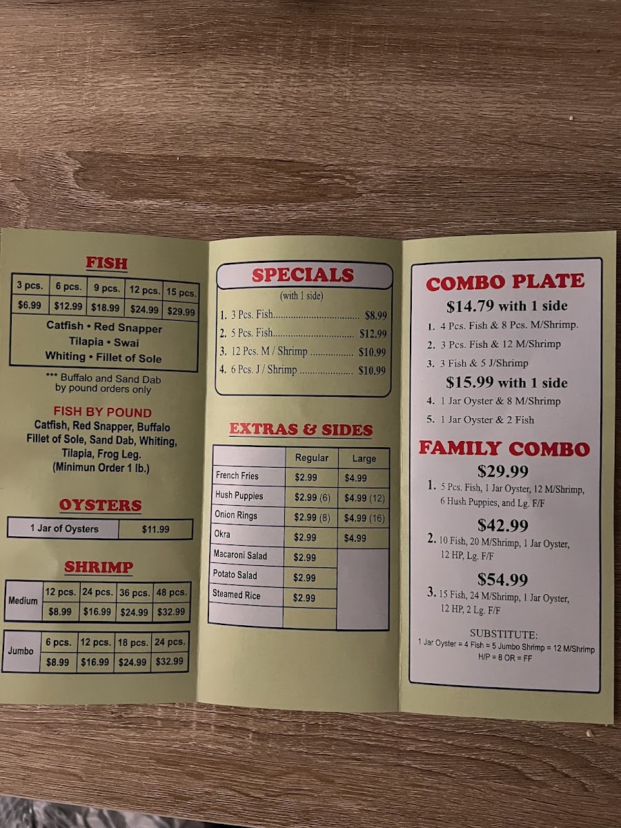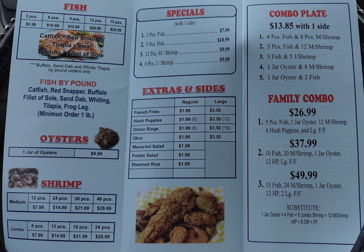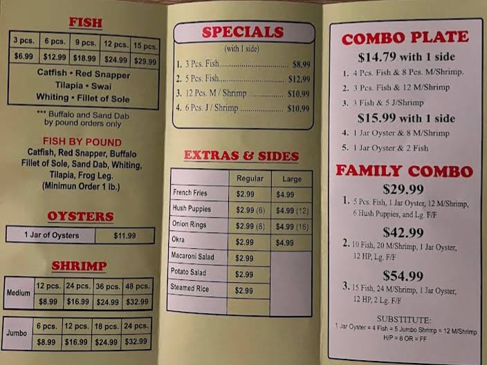 The menu at Family Fish and Shrimp offers a straightforward and approachable selection of seafood and comfort food, perfect for casual dining or a quick, satisfying meal. It features classic fried fish and shrimp dishes alongside simple sides like French fries, hush puppies, and potato salad, making it easy to put together a meal that fits your appetite and mood.