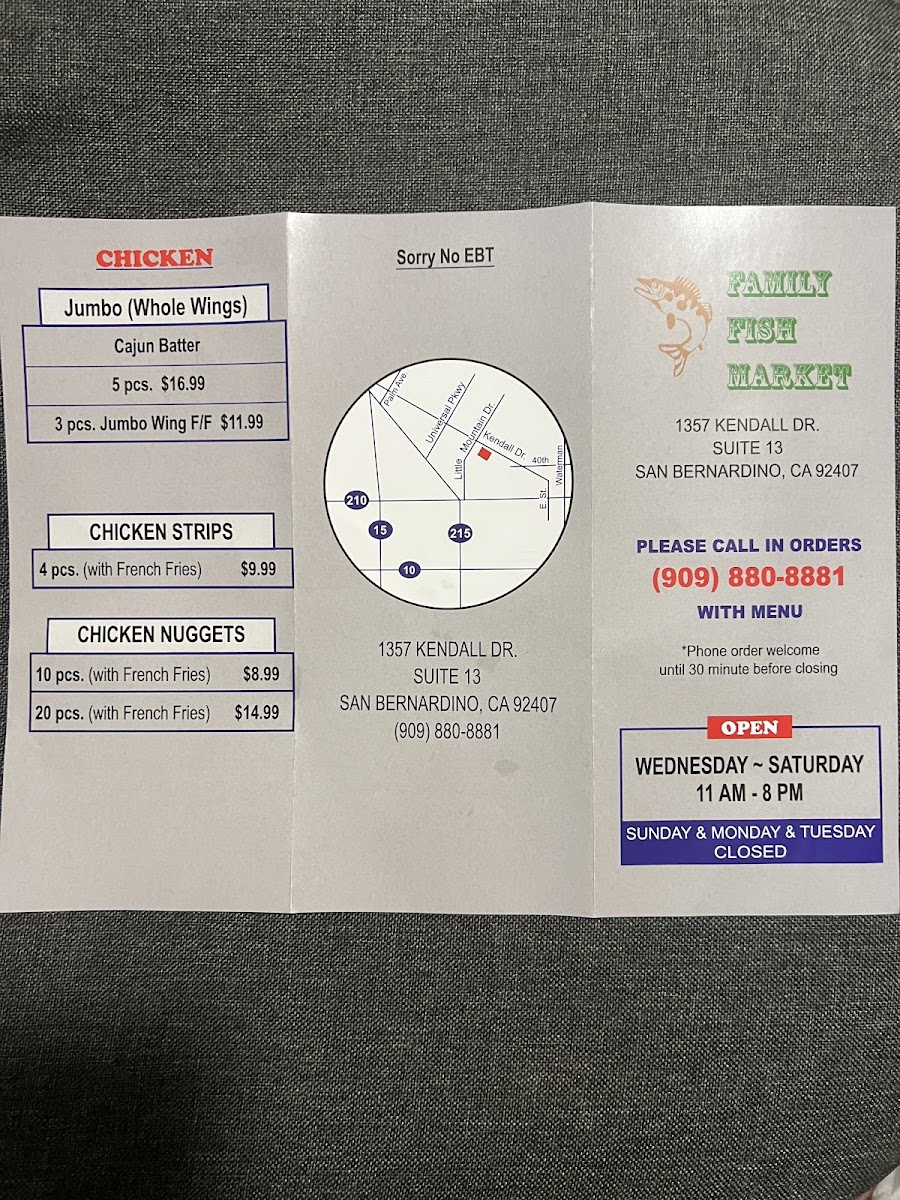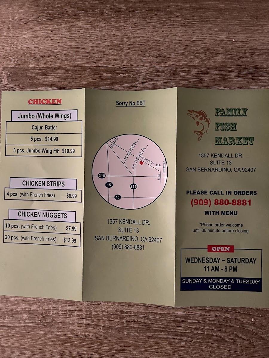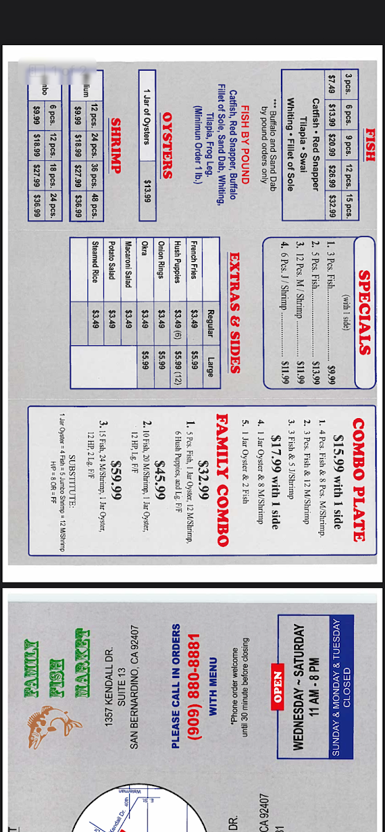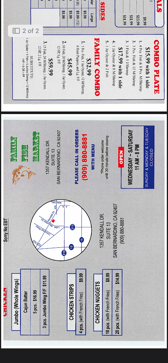 The menu at Family Fish and Shrimp offers a straightforward and approachable selection of seafood and comfort food, perfect for casual dining or a quick, satisfying meal. It features classic fried fish and shrimp dishes alongside simple sides like French fries, hush puppies, and potato salad, making it easy to put together a meal that fits your appetite and mood.